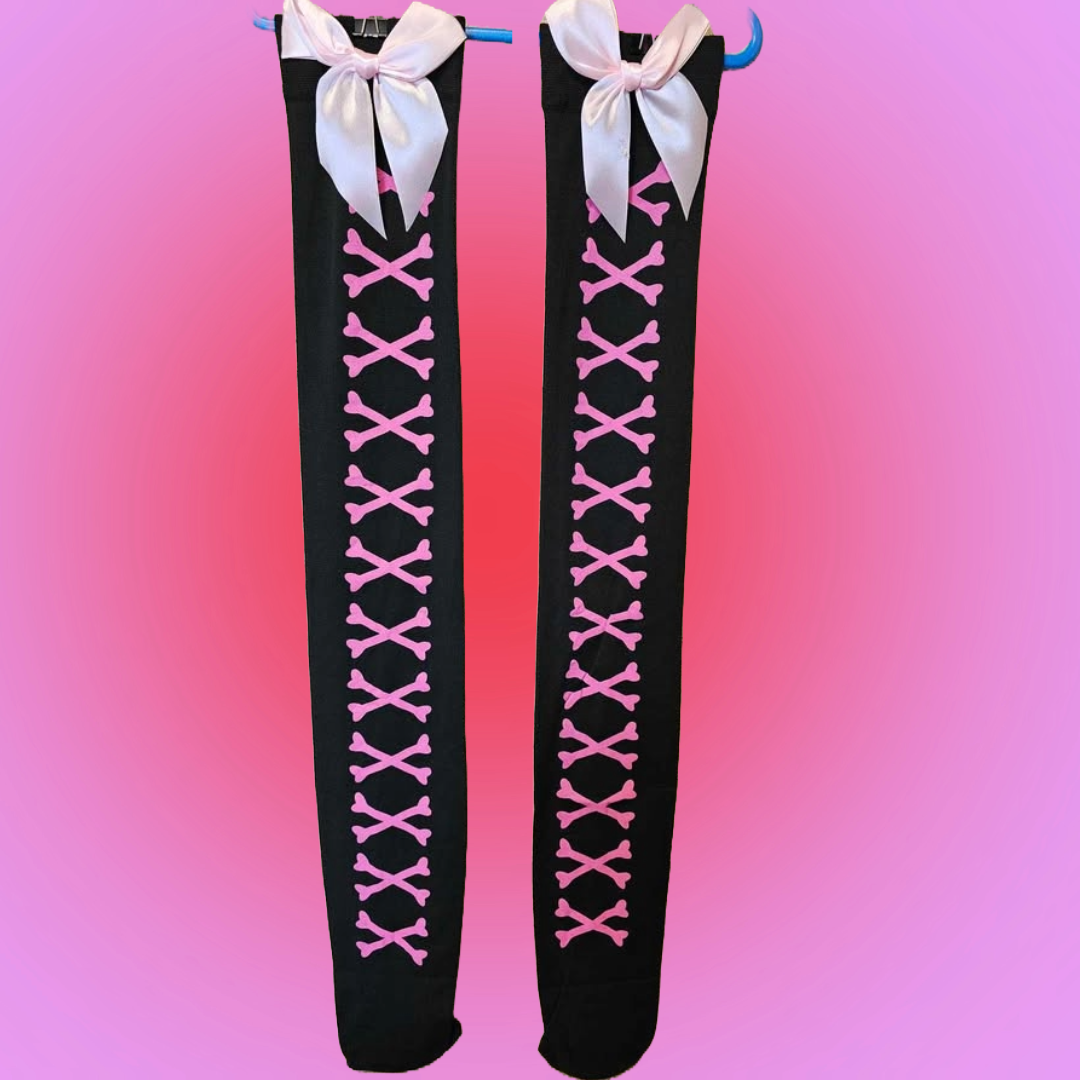 Elevate your outfit with these stylish long knee-high black socks, featuring cute laces and a bow at the top. Perfect for adding a playful yet sophisticated touch to any look.