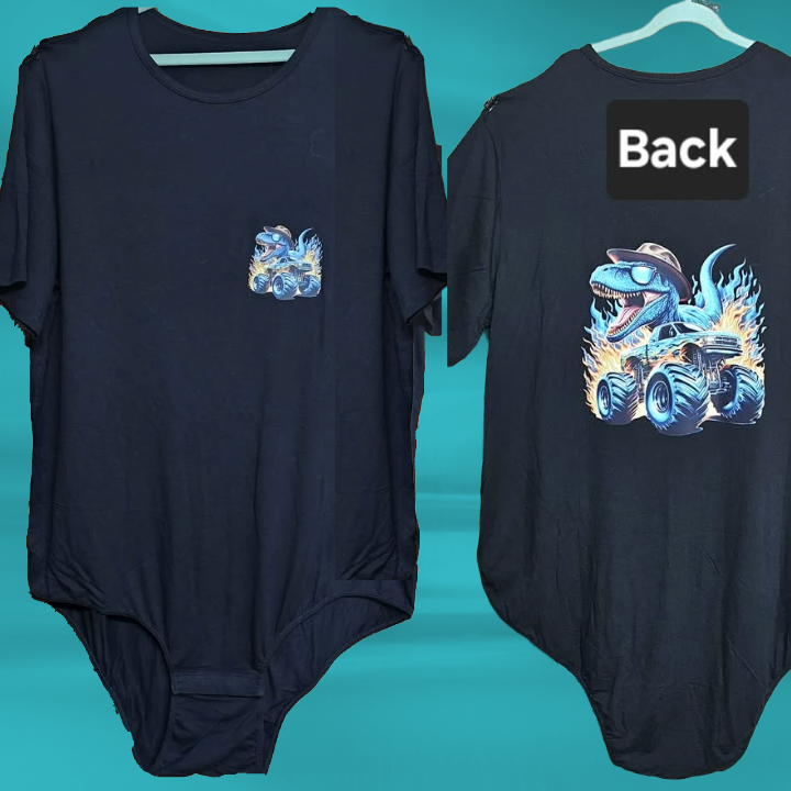 XL Men’s Short-Sleeved ABDL Romper – “Funny Dino Monster Truck” print that’s pure comfort chaos.